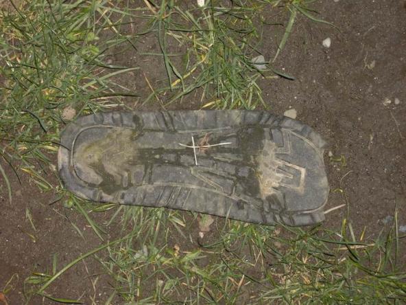 diese Sohle , Rest eines Schlappen liegt plattgedrückt in der matschigen Rheinwiese