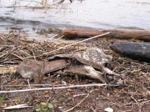 Noch zusammenhängende Fragmente eines ehemaligen Turnschuhs.