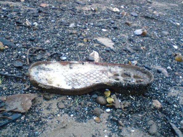 braune Plastiksohle gefüllt mit Schaum aus der Brandung.