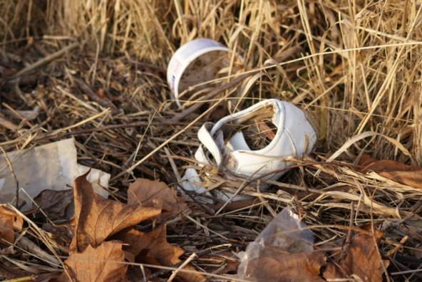 weißer Turnschuh mit Klettverschluß wendet steckt den Kopf in den Sand