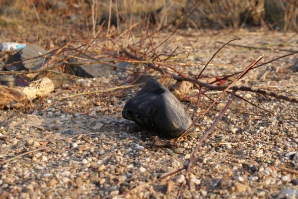Schwarzer Sneaker der am Flussbett auf der Seite liegt.