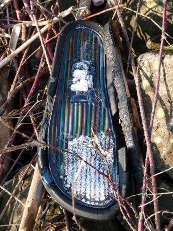 Latschen mit bunten Längsstreifen und fehlendem Querriemen