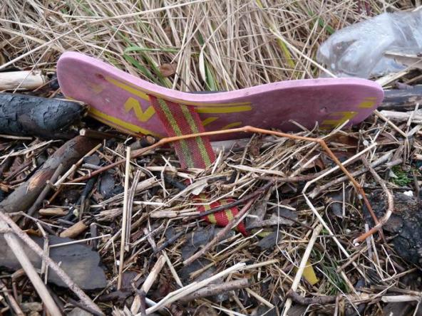 leere Flasche versucht sich hinter dem rosa Flip-Flop zu verstecken
