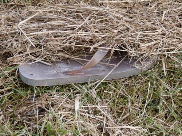 intakte Pinnlatsche, die versucht, sich im Stroh zu verstecken.