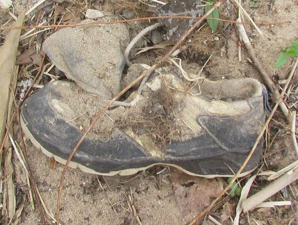 Bequeme sportliche Halbschuhe mit heller Sohle zum Schnüren. Sieht gut erhalten aus und hat sich in der Natur etwas abgetarnt.