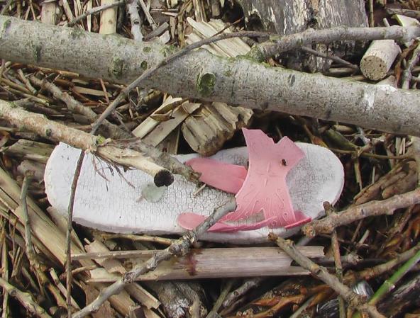 RosaSchlappe mit defekten zart rosa Schlaufen auf dem Weg durchs Treibholz.