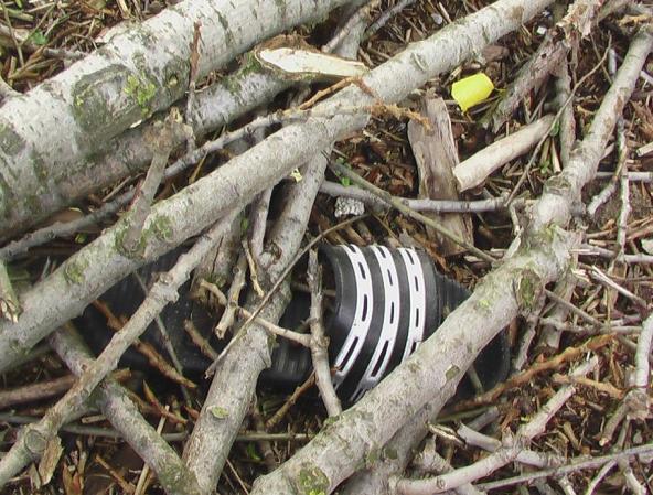 Schwarzweiße Schlappe aus unverwüstlichem Kunststoff ruht sich im Treibholz aus.