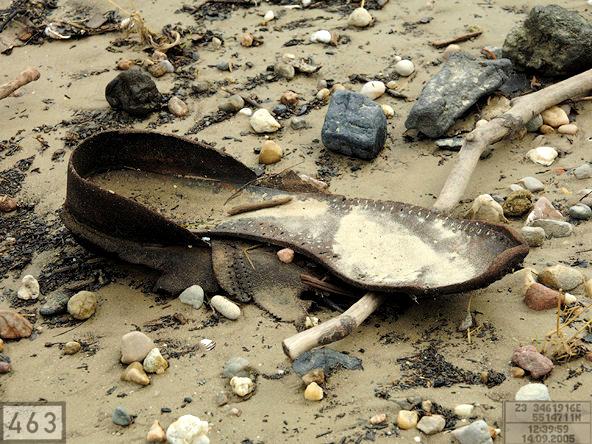 Der Rest von einem Schuh lag zwischen Sand und Steine, die der Rhein vor kurzem hinterlassen hatte.