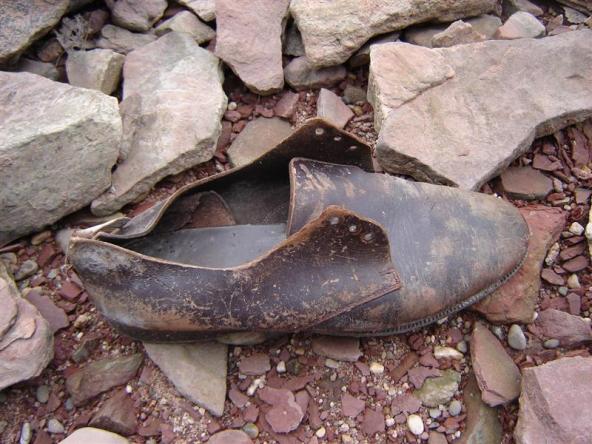 Eleganter, feiner und wohl ehemals brauner Halbschuh aus Leder. Er wirkte so, als ob er mit etwas Wind gleich los fliegen würde. Hübsch fand ich auch die sechs Schnürsenkellöcher zum Durchgucken.
