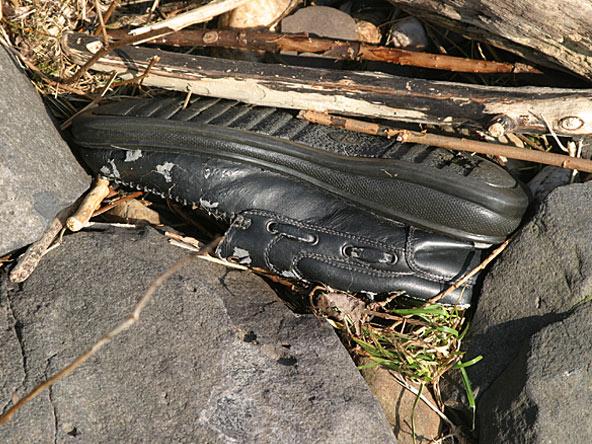 Guterhaltener Herrenslipper eingezwengt zwischen dicken Steinen.